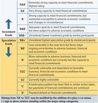 Výše uvedená tabulka ukazuje stupnici, kterou používá ratingová agentura Standard & Poor’s. Ratingy dělí do dvou kategorií, a to ratingy investičního stupně a ratingy spekulativního stupně. Nejvyšší možný rating ‘AAA’ v podstatě znamená, že existuje nízké riziko defaultu (nesplnění závazků) dlužníka, i v případě nepříznivých ekonomických podmínek. Rating ‘CCC’ od Standard & Poor’s naopak znamená, že default dlužníka je reálnou možností a rozhodujícím způsobem závisí na tržních podmínkách, příznivém ekonomickém prostředí.